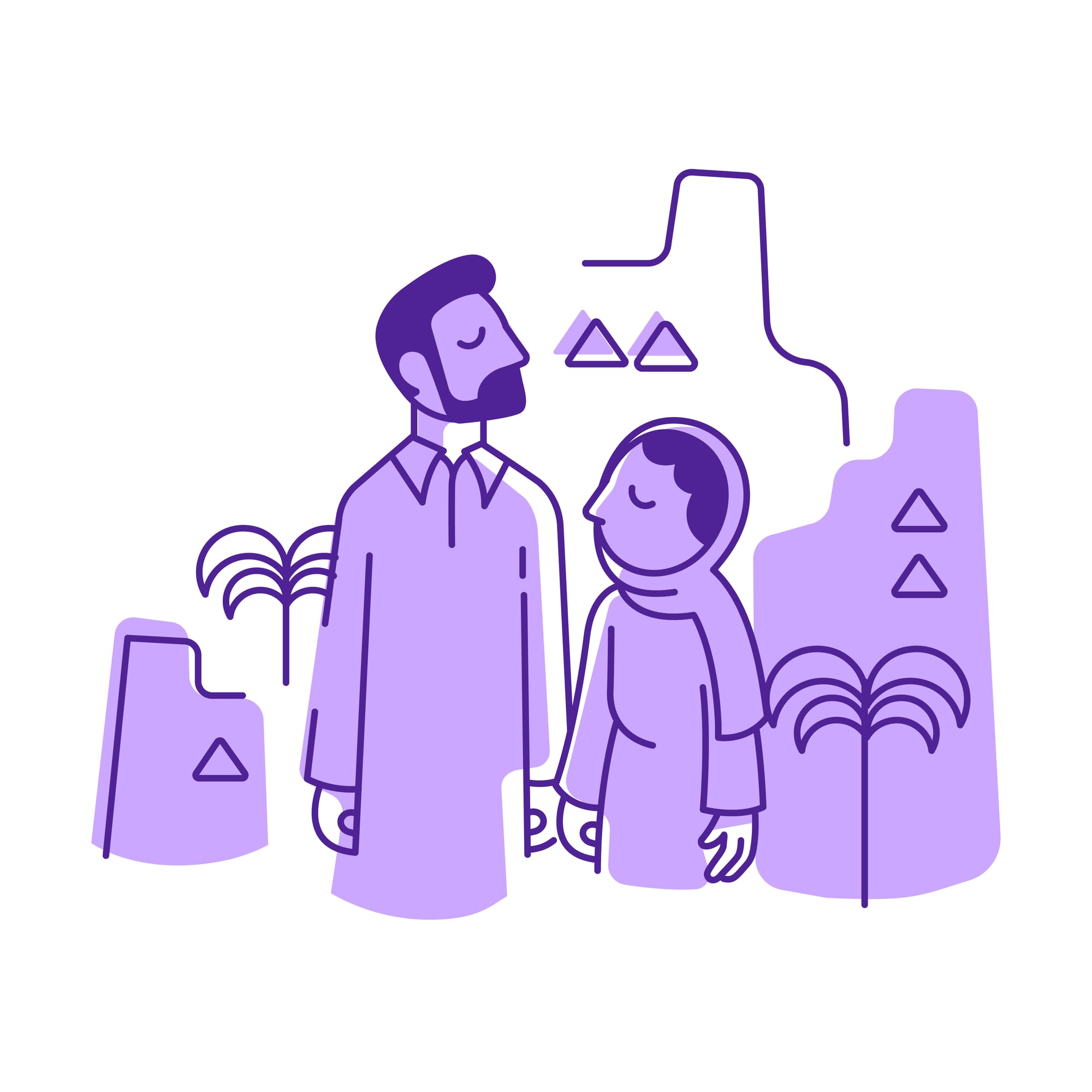 While simple in design, the gate is dynamic and adaptable, allowing it to represent various activities and accommodations. This flexibility helps visually communicate the brand’s diverse offerings. Additionally, the gate functions as the letter “n” in our word-mark, enabling the brand to be recognized even without the full logo, while also serving as a solution to the brand’s pronunciation challenges, as the stylized “n” helped people correctly pronounce the brand’s name by directing attention to it. Illustrations were instrumental in the identity as they complimented the geometric logo and elements with a lighthearted style. To reinforce the brand’s hospitality and warmth, we chose lavender as the primary color, while earthy tones convey authenticity and a sense of belonging. The secondary colors draw inspiration from Saudi Arabia’s diverse landscapes, enriching the brand identity and encouraging the discovery of various destinations.